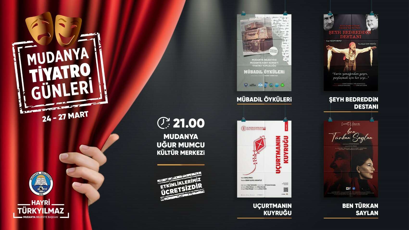 Mudanya Belediyesi, 24-27 Mart tarihlerinde 4 farklı oyunu tiyatroseverlerle buluşturuyor. Mudanya Tiyatro Günleri çerçevesinde 24 Mart Cuma günü Mudanya Kent Konseyi’nin “Mübadil Öyküleri”, 25 Mart Cumartesi günü Canım Tiyatro Topluluğu’nun “Şeyh Bedreddin Destanı”, 26 Mart Pazar günü Bursa Devlet Tiyatrosu’nun “Uçurtmanın Kuyruğu”, 27 Mart Pazartesi günü ise Levent Üzümcü Tiyatrosu’nun “Ben Türkan Saylan” adlı oyunları saat 21.00’da ücretsiz olarak Uğur Mumcu Kültür Merkezi’nde seyirciyle buluşacak.