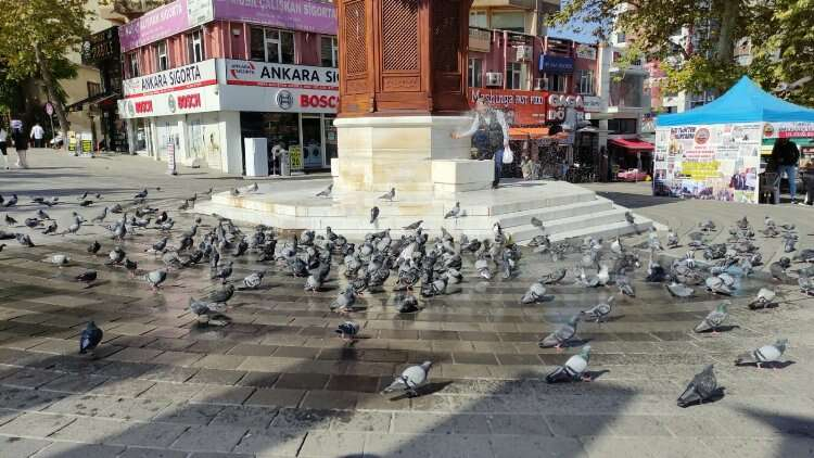 Bursa’da bir vatandaş meydanda bulunan çeşmenin musluğundan güvercinleri saatlerce ıslattı. Sıcak havada güvercinler saatlerce banyo keyfi yaptı.