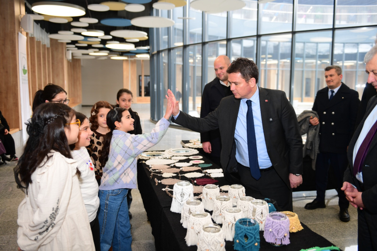 inceleyen Başkan Aydın, ürünler hakkında bilgiler alarak, minik ellerden çıkan anlamı büyük eserler için