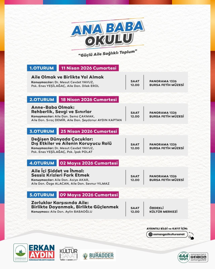 Toplumun en temel yapı taşı olan aileyi güçlendirmeye yönelik önemli projeleriyle dikkat çeken Osmangazi Belediyesi, yeni ve kapsamlı bir eğitim programını daha hayata geçiriyor. “Güçlü Aile Sağlıklı Toplum” mottosuyla hazırlanan Ana Baba Okulu, ebeveynlere rehberlik edecek ve aile içi iletişimi daha sağlam temellere oturtacak zengin içeriğiyle kapılarını açıyor.