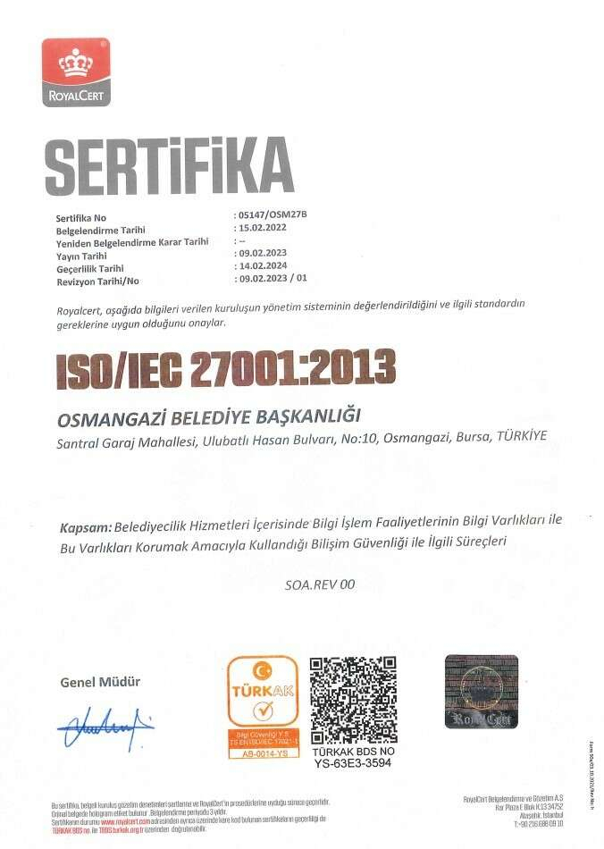 Bugüne kadar gerçekleştirdiği vatandaş odaklı çalışmalarında kaliteden ödün vermeyen Osmangazi Belediyesi, aynı zamanda muhasebe, finans, insan kaynakları, hukuk ve bilgi işlem faaliyetlerinin elektronik bilgi varlıkları ile bu varlıkları korumak amacıyla kullandığı bilişim güvenliğini de inceleme fırsatı yakaladı. Yapılan tüm çalışmalar neticesinde önceki yıllarda almaya hak kazandığı “ISO 27001:2013 Bilgi Güvenliği Yönetim Sistemi” sertifikasını bu yıl da yeniledi.