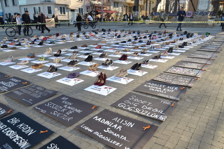 Bursa'nın Mudanya ilçesinde 25 Kasım Kadına Yönelik Şiddete Karşı Uluslararası Mücadele Günü nedeniyle düzenlenen etkinlikte sessiz yürüyüş gerçekleştirilerek, kadın cinayeti kurbanlarını temsilen yere yüzlerce ayakkabı bırakıldı.