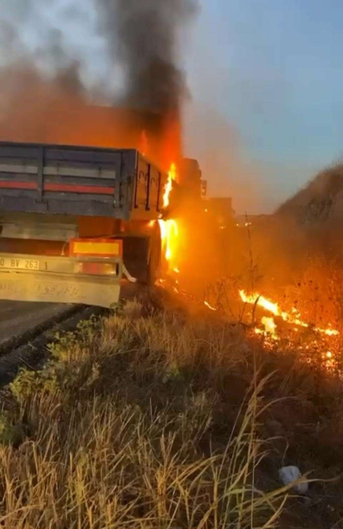 Bursa’nın Mustafa Kemal Paşa ilçesinde sürücüsünün idaresinde olan tırın dorse kısmında bir anda dumanlar yükseldi. Sürücünün durumu fark etmesiyle araç hemen kenarı çekildi. Hızla büyüyen alevler tırdan anayoldaki otluk alana sıçradı. Sürücünün ihbarı üzerine olay yerine itfaiye ekibi sevk edildi. Alev topuna dönen tırı söndüren ekipler yol kenarında otluk alana sıçrayan alevleri de hızla söndürdü. Tırın alev alev yandığı anlar kameraya yansırken, yangında korkulan olmadı.