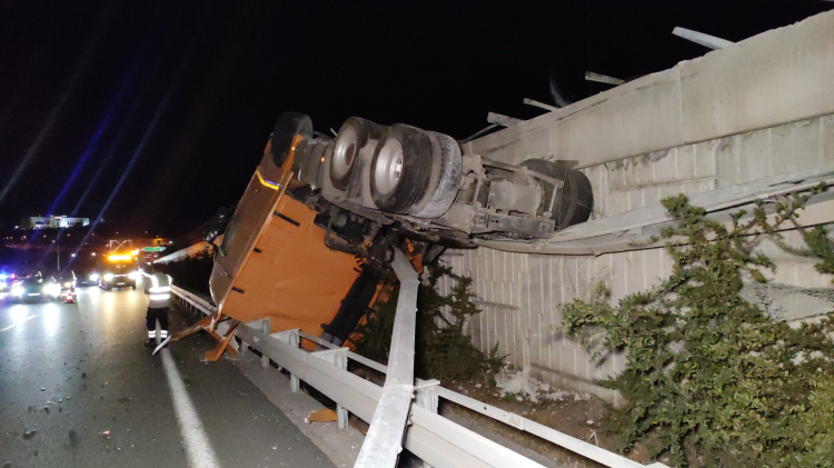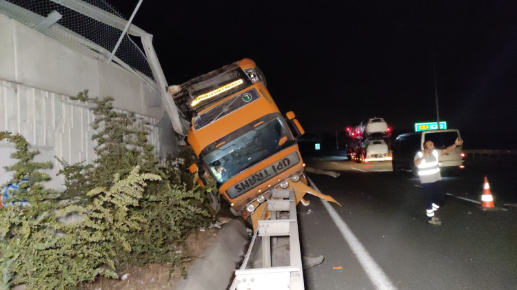 Gebze-Orhangazi-İzmir Otoyolu'nda kontrolden çıkan tır, 3 metre yükseklikten karşı şeride uçtu. Refüjde asılı kalan dorsenin parçaları yola savrulurken, kaza sırasında yolda araç bulunmaması büyük bir facianın önüne geçmiş oldu.