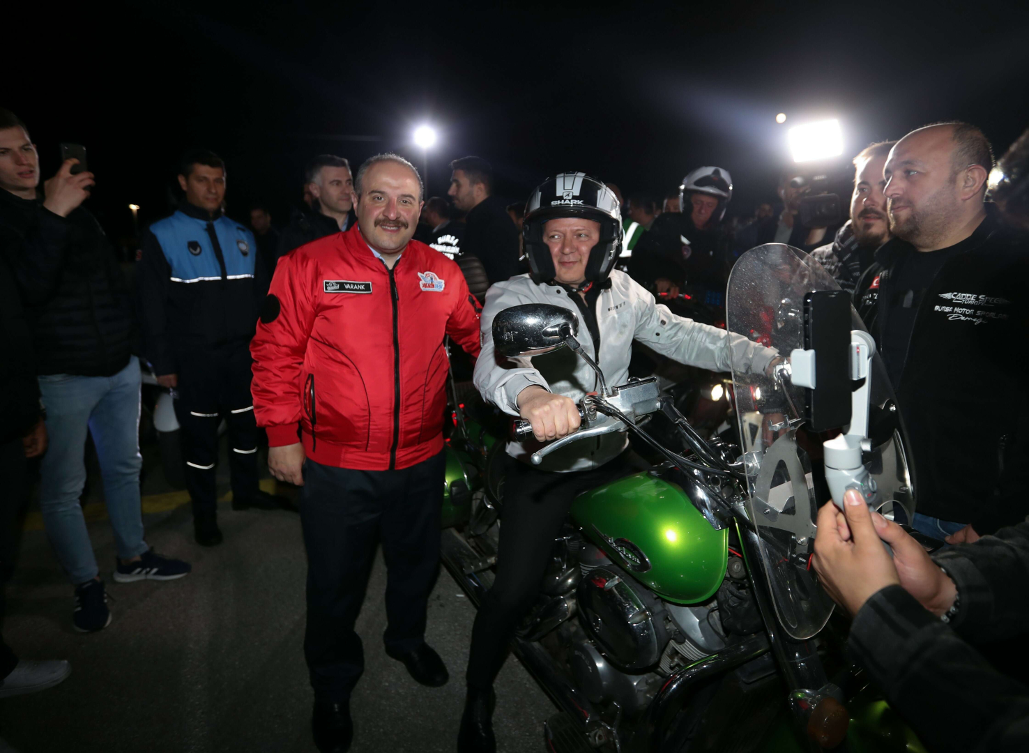 Motosikletçiler, Bakan Varank’a üzerinde Atatürk ve Türk bayrağı bulunan kırmızı bir motorcu yeleği hediye etti. Motorcuların havalimanı pistindeki sürüş eğitimini izleyen Varank, ekstrem enduro kategorisinde Bursa’yı temsil eden gençlerin gösterisini takip etti.