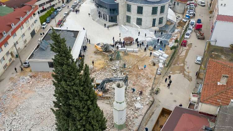 İş makinesinin önce deldiği minare daha sonra çelik halat ile bağlanıp başka bir iş makinesi ile çekilerek aşağıya indirildi. Yerleşim yerleri ile iç içe olan dev minare büyük bir ustalık ile hiç bir eve zarar vermeden yıkıldı. O anlar dron ile havadan da görüntülendi.
