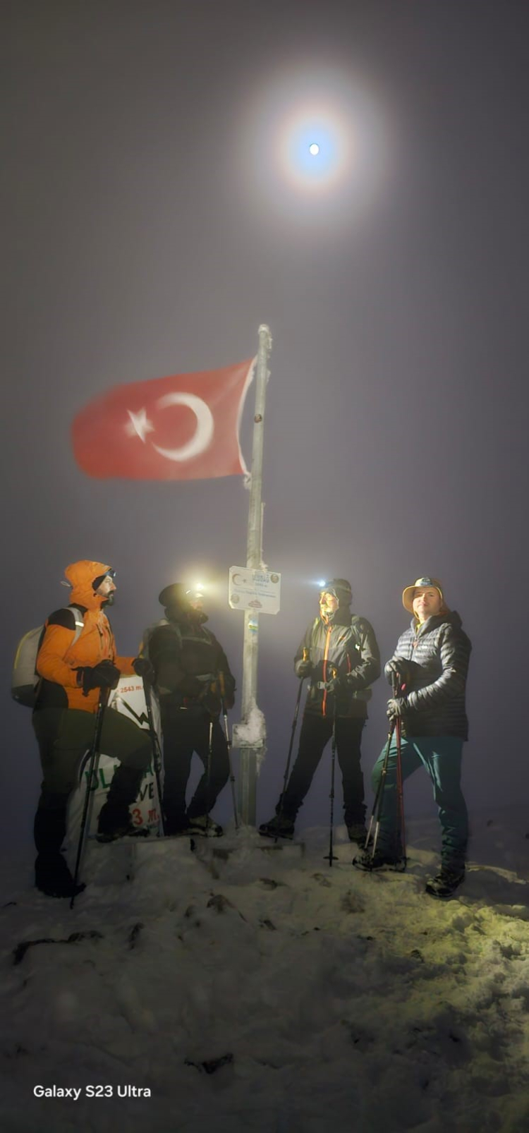 2 grup dağcı yeni yağan karların üzerinde ilerleyip bayrak tepeye ulaştı. Dağcıların bulutların üzerinde yaptıkları zirve yürüyüşü drone ile de görüntülendi. Gece yapılan zirve yürüyüşüne ise aralarında Bursalı usta dağcı İsmet Şentürk'ün de bulunduğu 5 dağcı katıldı. Havanın kararmasıyla birlikte yürüyüşe başlayan dağcılar yolun daha yarısına gelmeden tipi ve fırtınaya yakalandı. Zorlu hava şartlarına yürüyüşü bırakmayan dağcılar 3,5 saat sonra zirveye ulaşmayı başardı.