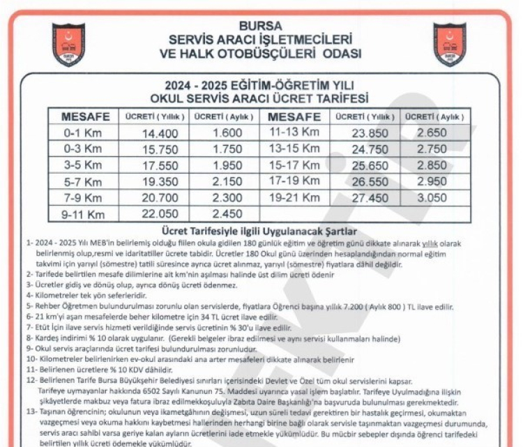 Bursa'da 2024-2025 eğitim öğretim yılı servis ücretlerine, yüzde 46 aralığında zam yapıldı. Gelen ara zamdan sonra, 0-1 kilometre arası olan güzergah bin 600, 0-3 kilometre olan güzergah bin 750 lira, 3-5 kilometre olan güzergah bin 950, 5-7 kilometre güzergah 2 bin 150 lira, en uzak mesafe olan19-21 kilometre 3 bin 50 lira olarak açıklandı. Ayrıca, rehber bulundurma zorunluluğu olan araçlarda ise 500 lira olan rehber öğretmen fiyatı ise 800 lira olarak açıklandı.