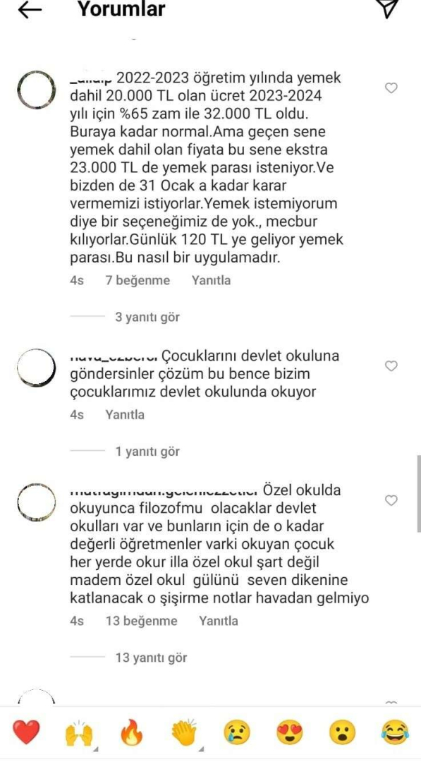 “Anaokulu için verdikleri ortalama fiyat eğitim ve kırtasiye ortalama 100 bin lira civarındadır. Daha üstü fiyat veren okulda var. Şu an içinde bulunduğumuz yıla ortalama 30 ile 50 bin civarında kayıt yapılmışken, önümüzdeki yıl 100 bin liranın üzerinde ödeme yapılması korkunç bir durumdur. Ayrıca sözleşme harici enflasyona ve asgari ücrete dayalı ara zamda yapıyorlar. 4 Şubat’a kadar kayıt için zaman biçip, daha 4 Şubat gelmeden kırtasiye masrafına 2 bin lira zam yaptılar. ‘Kırtasiye masrafları dolarla alındığı için gün geçtikçe fiyat artıyormuş’ diye de açıklamada bulunuyorlar.”