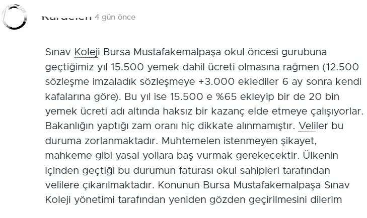 “Sınav Koleji Bursa Mustafakemalpaşa okul öncesi gurubuna geçtiğimiz yıl 15 bin 500 yemek dahil ücret bu sene yüzde 65 ekleyip bir de 20 bin yemek ücreti adı altında haksız bir kazanç elde etmeye çalışıyorlar. Bakanlığın yaptığı zam oranı hiç dikkate alınmamıştır. Veliler bu duruma zorlanmaktadır. Muhtemelen istenmeyen şikayet, mahkeme gibi yasal yollara baş vurmak gerekecektir. Ülkenin içinden geçtiği bu durumun faturası okul sahipleri tarafından velilere çıkarılmaktadır. Konunun Bursa Mustafakemalpaşa Sınav Koleji yönetimi tarafından yeniden gözden geçirilmesini dilerim."