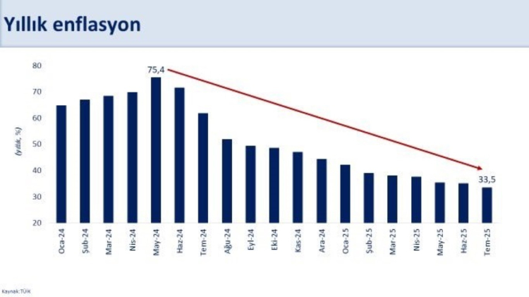 "Enflasyon 44 ayın en düşük seviyesinde. Aylık enflasyon temmuzda geçici ve dönemsel etkilerle yüzde 2,06 gerçekleşirken yıllık enflasyon son 12 ayda 28,3 puan düşüşle yüzde 33,5’e geriledi. Yıllık gıda enflasyonu yüzde 28, temel mal enflasyonu yüzde 20,7 oldu. Hizmet enflasyonu üç yılı aşkın sürenin ardından ilk kez yüzde 50’nin altına indi. Dezenflasyon süreci hedeflerimiz doğrultusunda ilerlemektedir. Yıl sonunda enflasyonun TCMB’nin tahmin aralığında gerçekleşeceğini öngörüyoruz. Enflasyondaki düşüş, öngörülebilirliği artırarak yurtiçi finansal şartların ve yatırım ortamının daha da iyileşmesine katkı sağlayacaktır. Temel önceliğimiz olan kalıcı fiyat istikrarını sağlamak için programımızı kararlılıkla uygulamaya devam edeceğiz."