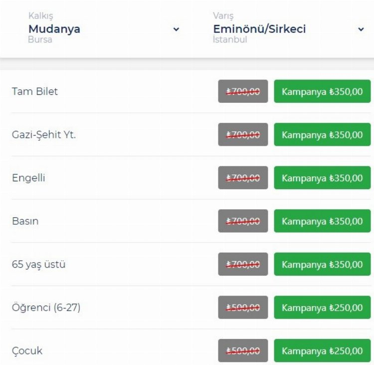 Bursa'nın Mudanya ilçesinden hareket eden deniz araçları, İstanbul'un Eminönü/Sirkeci iskelesine ulaşım sağlıyor. BUDO, 22 Ocak 2024 tarihinde yaptığı zam ile fiyatları 230 lira olarak açıkladı. Bu fiyatların üzerine yüzde 52'lik artış ile biletler 350 liraya çıkarıldı.