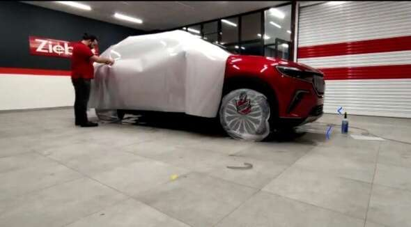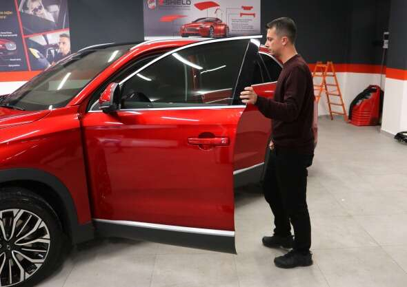 Türkiye'nin ilk yerli ve milli otomobili Togg`u Adana`da satın alan bir kişi, aracını kentin sıcağından korumak için camlarına film kaplatıp, rengi de güneşten solmasın diye boya koruma filmi yaptırdı.