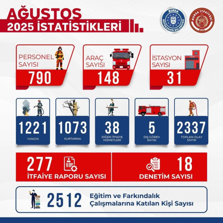 Bursa Büyükşehir Belediyesi'nin ekip, ekipman, hizmet binaları ve yeni araçlarla güçlendirmeye devam ettiği itfaiye teşkilatı, vatandaşların huzuru için gece gündüz demeden çalışmalarını sürdürüyor. Bursa'da 31 istasyonda 790 personel, 148 araçla hizmet veren İtfaiye Daire Başkanlığına bağlı ekipler, Ağustos ayında da birçok olaya müdahale etti.