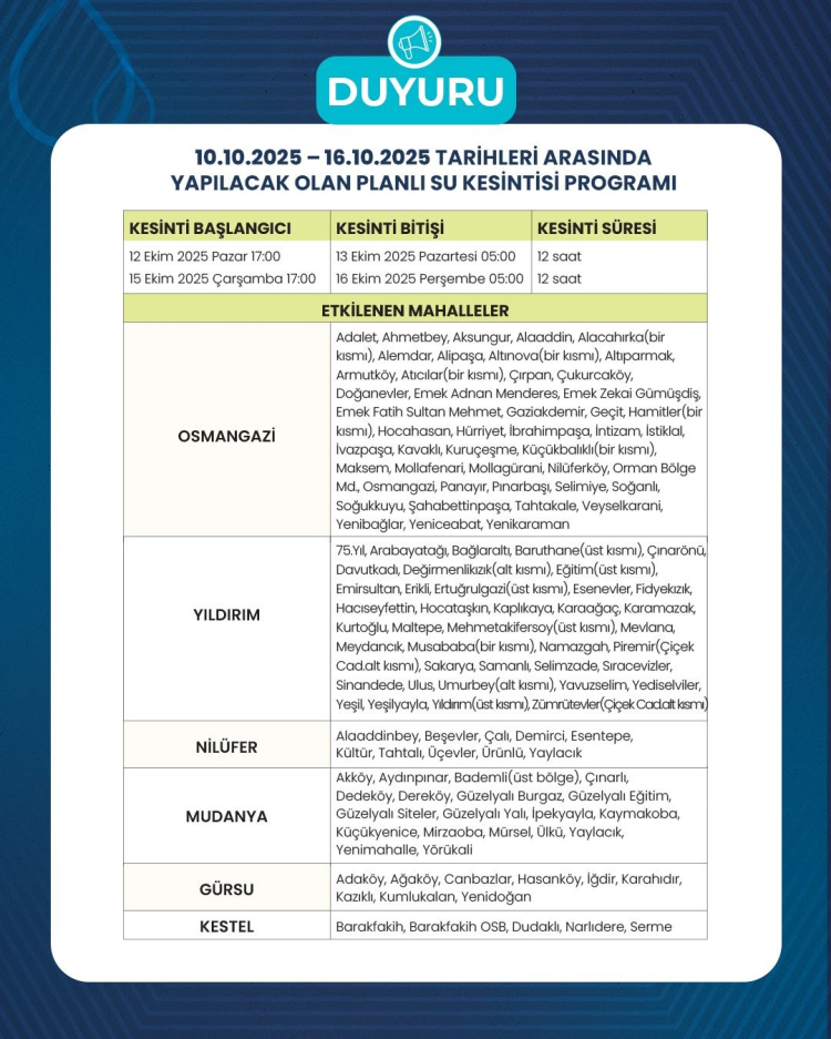 Söz konusu planlı su kesintileri, günlük 12 saati geçmemek kaydıyla, merkez ilçelere bağlı mahallelerde dönüşümlü olarak uygulanacaktır. Yapılması planlanan su kesintileri ile günlük 100 bin metreküp su tasarrufu yapılması hedeflenmektedir. Planlı su kesintilerinden Uludağ Üniversitesi, Şehir Hastanesi ve Devlet Hastaneleri etkilenmeyecektir.