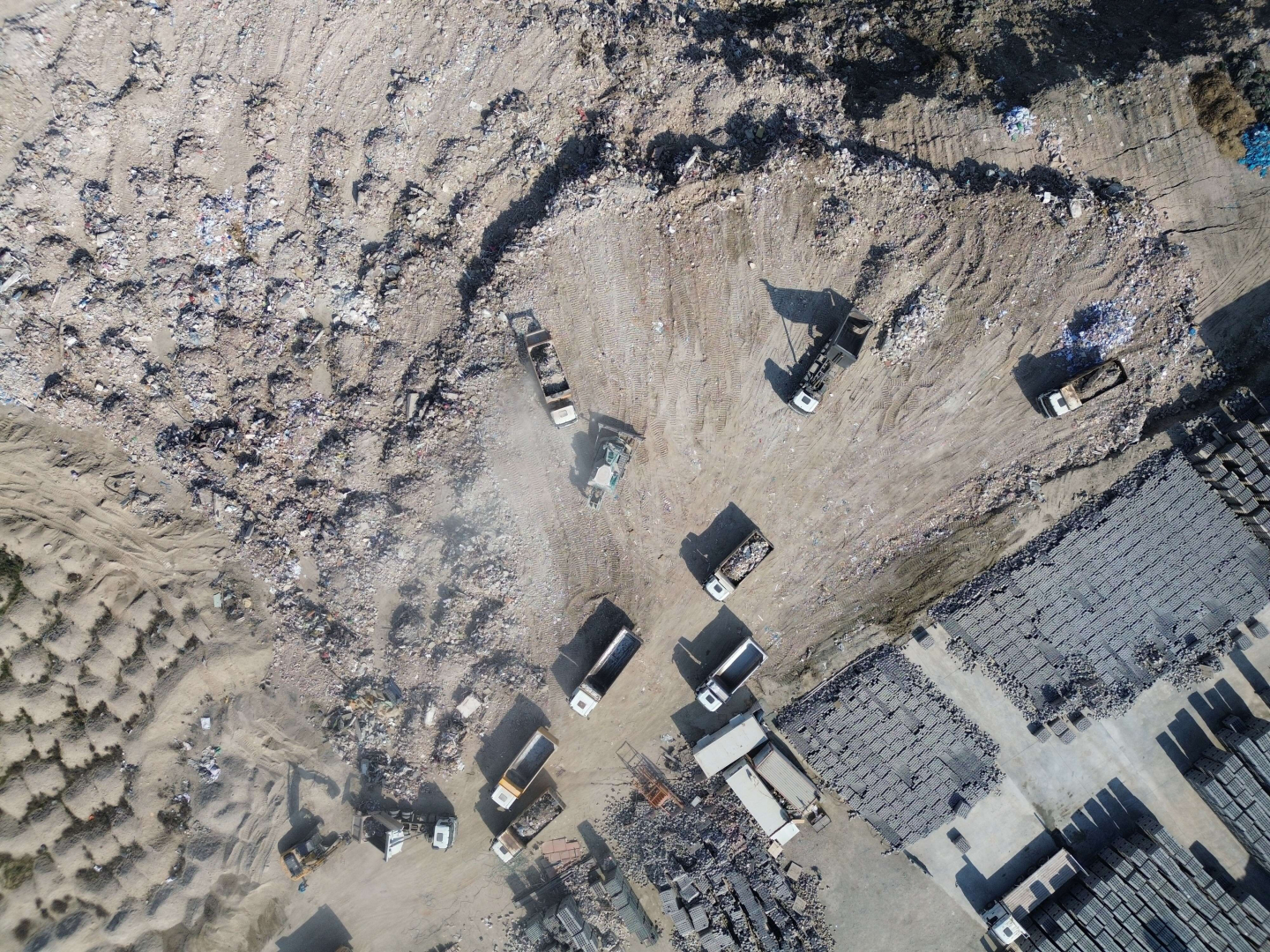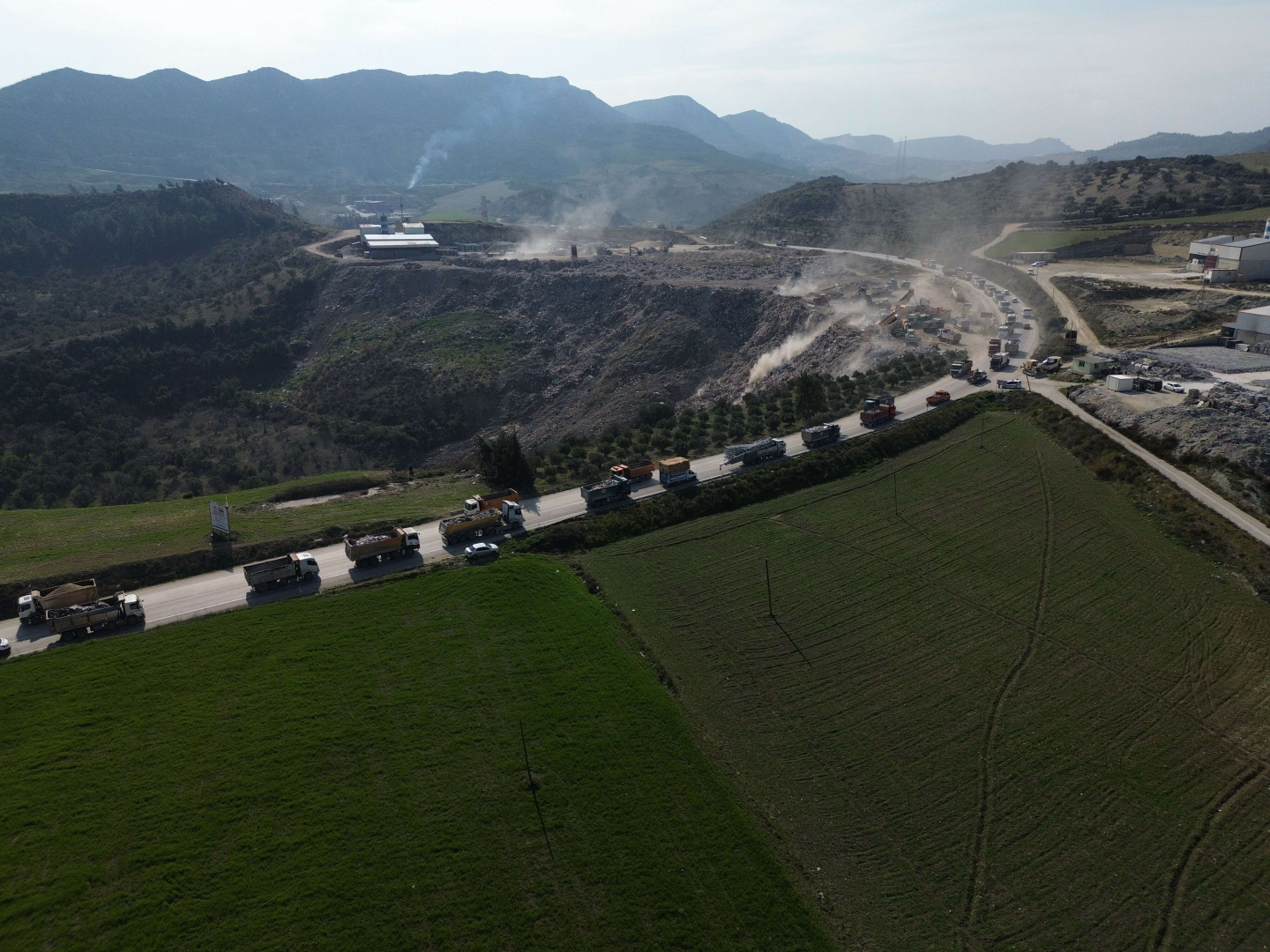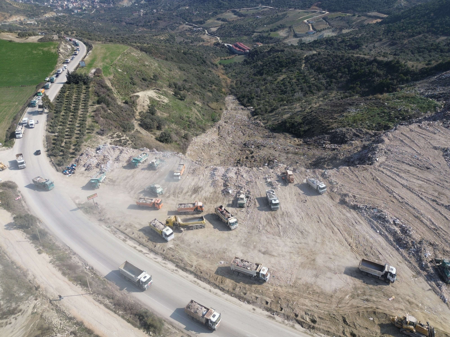Hatay'da meydana gelen şiddetli depremlerin ardından şehirde bulunan binaların büyük bir kısmı yıkıldı. İlk meydana gelen depremden 19 gün geçmesinin ardından yıkılan binaların bazılarında hala arama kurtarma çalışmaları devam ederken, bazı binalarda çalışmalar tamamlandı. Kurtarma çalışması biten binalara giren kepçe ve kamyonlar, süratla enkaz kaldırma işlemlerine devam ediyor. Hafriyat kamyonları yükledikleri enkazı şehre yakın bir noktaya taşımak için gün içerisinde defalarca sefer düzenliyor. Kamyonların enkazı boşalttıkları alana giderken oluşturduğu metrelerce kuyruk, drone ile havadan görüntülendi.