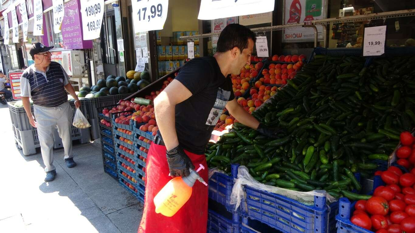 Fatih Kocamustafapaşa’da manav dükkanı işleten Mehmet Şavli, sıcaktan korunmak için hem kendini hem de meyvelerini suladı. Şavli, ‘’Bu sene çok sıcak, bittik, mahvolduk. 10 senedir böyle bir sıcaklık görmemiştik. Meyveler de yandı, biz de yandık. Kendimizi ıslatıyoruz. Meyveleri de yanmasın diye ıslatıyoruz. Yoksa kaynıyor. Sıcaktan meyveler dayanamıyor, çürüyor. Bu sıcaklardan dolayı ürünler de pahalanıyor. Hem ürünler hem de biz yandık’’ dedi.