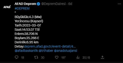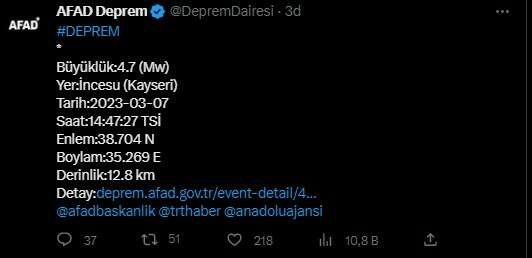 AFAD'dan son dakika deprem açıklaması geldi. AFAD verilerine göre saat 14.47'de merkez üssü Kayseri İncesu olan olan 4.7 büyüklüğünde bir deprem meydana geldi. Öte yandan 14.53'te 4,3 büyüklüğünde bir deprem daha gerçekleşti.