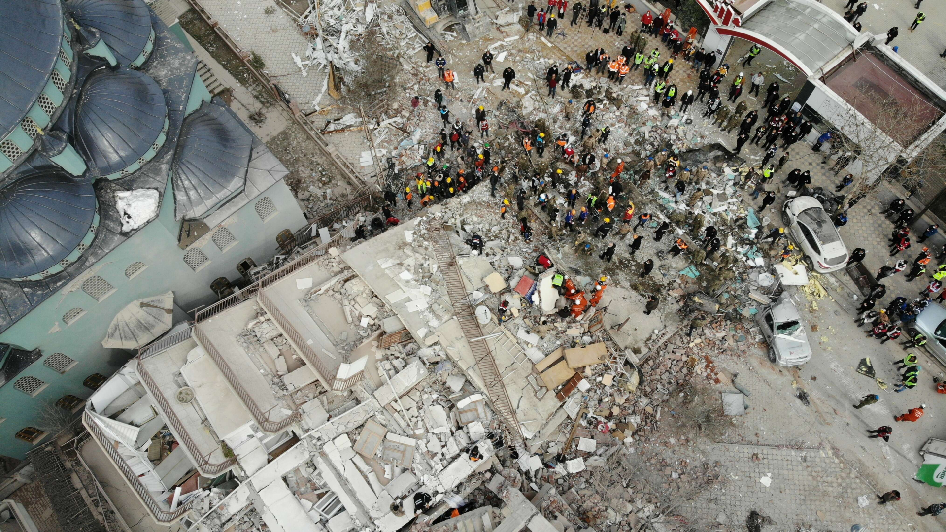 Malatya'da meydana gelen 5.6 büyüklüğündeki depremde yıkılan binaların enkazında arama kurtarma çalışmaları sürüyor. 3 kişinin bulunduğu 5 katlı bir binadaki çalışma havadan görüntülendi.