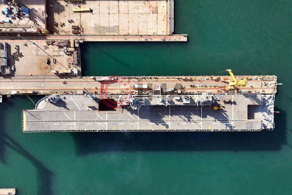 Türk Deniz Kuvvetleri'nin amiral gemisi olacak TCG Anadolu veya Anadolu L-400 isimli amfibik hücum gemisinin son durumu havadan görüntülendi. Büyük bir kısmı tamamlanan 232 metre genişliğindeki gemi tüm heybeti ile görenleri kendine hayran bırakıyor. TCG Anadolu ana yapılandırması bakımından Türkiye'nin amfibi hücum gemisi (LHD) sınıfına giren ilk gemi olma özelliğini taşıyor. 2014 yılında yapımına başlanan geminin çalışmalarında sona gelindi. TCG Anadolu tam donanımlı 8 helikopter bulundurabilecek. Geminin bir tabur tam teşekküllü askerin istenilen bölgeye sevkini sağlayabilme özelliği bulunuyor. Kıtalararası görevlere çıkabilecek elverişliliğe sahip olan geminin aktif olarak Mavi Vatan'ı koruması bekleniyor.