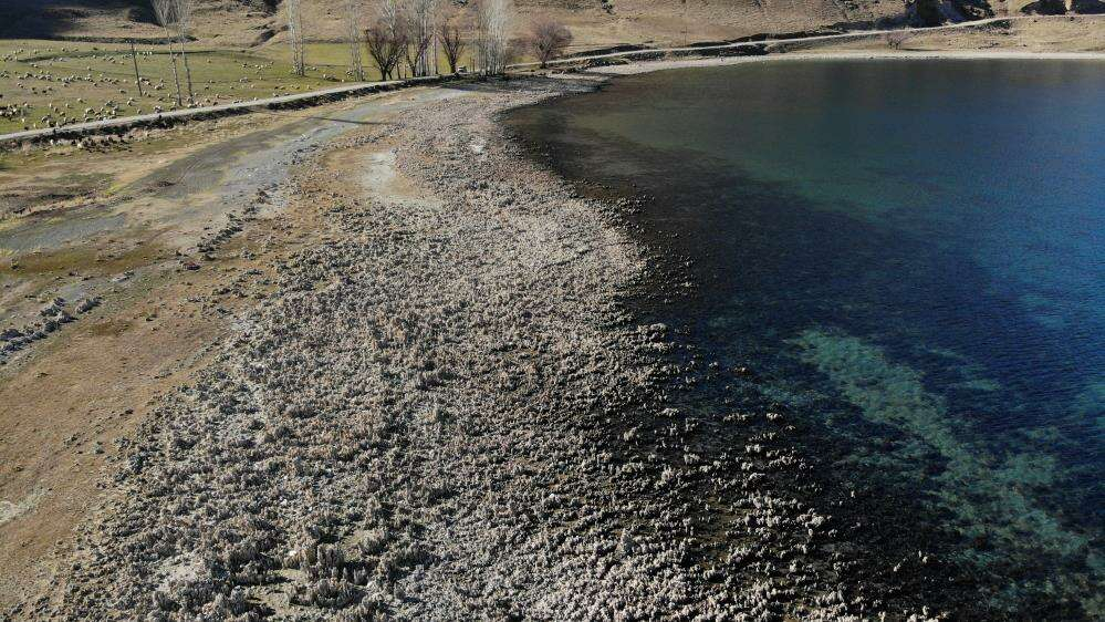 Dünyanın en büyük sodalı gölü olan Van Gölü'nde, iklim değişikliğine bağlı yaşanan kuraklık nedeniyle su çekilmesi devam ediyor. Özellikle son yıllarda dalış tutkunlarının ilgi göstermeye başladığı Van Gölü, bugünlerde su çekilme oranı ile gündemde. Van Gölü'nün Tatvan sahillerinde yaşanan su çekilmesi sonucu ortaya çıkan mikrobiyalitler de dikkatlerden kaçmıyor.