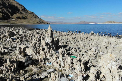 Van Gölü'nde sular çekildi, su altı peribacaları ortaya çıktı