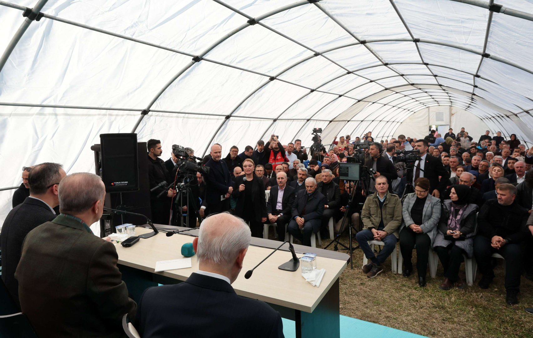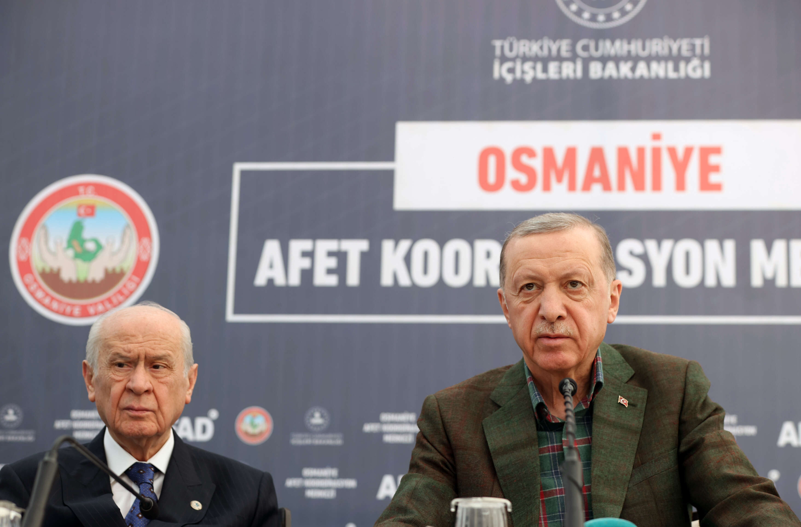 Cumhurbaşkanı Erdoğan, MHP Genel Başkanı Devlet Bahçeli ile birlikte Osmaniye Afet Koordinasyon Merkezi'nde basın toplantısı düzenledi. Erdoğan, "Dün Hatay merkezli 6.4 ve 5.8'lik depreme Kahramanmaraş'ta yakalandık. Bilim insanları 6 Şubat'taki depremi dünyada karada meydana gelen en şiddetli deprem olarak kaydediyorlar. Yıkımın şiddetini bizzat yerinde görme fırsatımız oldu. Birileri önemsizleştirmek istese de insanlık tarihinin en büyük afetlerinden biri olduğu gerçektir. Yaralarımızı sarmaya hayata yeniden tutunmaya çalışıyoruz. Yaşadığımız depremlerde yüreğimize ateş düştü. Deprem bölgesinde hayatını kaybedenlerin sayısı 41 bini geçerken 115 bin insanımız da yaralı olarak kurtarıldı. Osmaniye'de bin 30 vatandaşımızı toprağa verirken, 2606 yaralımız var. Vefat eden kardeşlerimize Allah'tan rahmet, yakınlarına başsağlığı, yaralılara acil şifalar niyaz ederim" dedi.