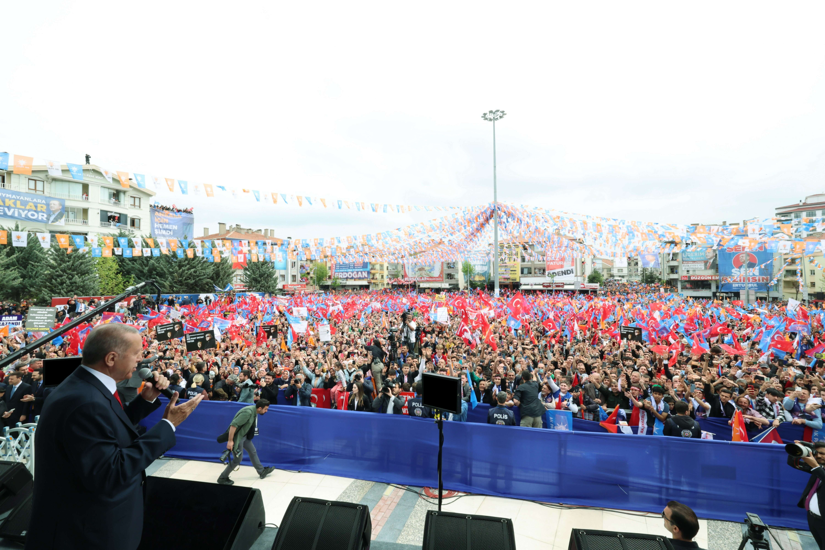 Erdoğan, gittiği mitinglerde eşi benzeri görülmeyen kalabalıklara hitap ettiğini belirterek, ”İlçe mitingi değil de il mitingi yapıyoruz sanki. Siyasi tarihimizde eşi benzeri görülmemiş bu kalabalıkların verdiği mesaj şuydu; milletimiz kazanımlarına el uzatanları affetmez. Geleceğine göz dikenleri affetmez. Kendisi ile değil terör örgütleriyle yol yürüyeni affetmez. Biz bu ülkeyi böldürtmeyeceğiz. Bay bay Kemal şunu bilesin ki bu ülkeyi böldürtmeyeceğiz. Yanına kimi alırsan al, kimlerle yol yürürsen yürü. Bu milletle yol yürümeyenleri 14 Mayıs'ta göreceğiz” açıklamasını yaptı.