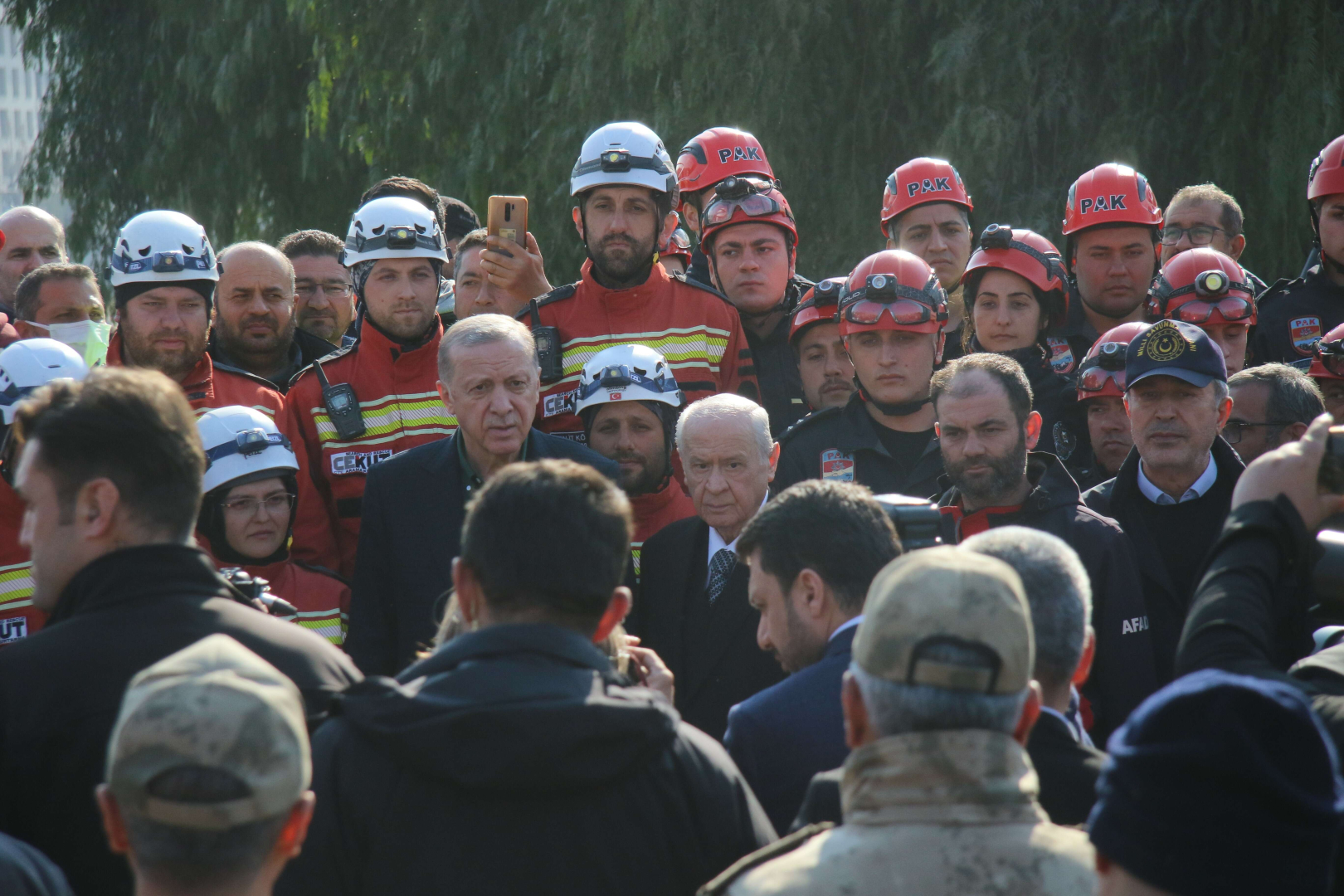 Cumhurbaşkanı Erdoğan ve MHP Lideri Bahçeli, depremin vurduğu Hatay'a geldi. Antakya'da incelemelerde bulunan Erdoğan ve Bahçeli'ye Milli Savunma Bakanı Hulusi Akar, İçişleri Bakanı Süleyman Soylu, Sağlık Bakanı Fahrettin Koca, Cumhurbaşkanlığı Sözcüsü İbrahim Kalın eşlik etti. Arama kurtarma çalışmalarına katılan ekiplerle tek tek görüşen iki lider, yaptıkları çalışmalar hakkında bilgi aldı. Erdoğan ve Bahçeli arama kurtarma ekipleriyle hatıra fotoğrafı çektirdi.