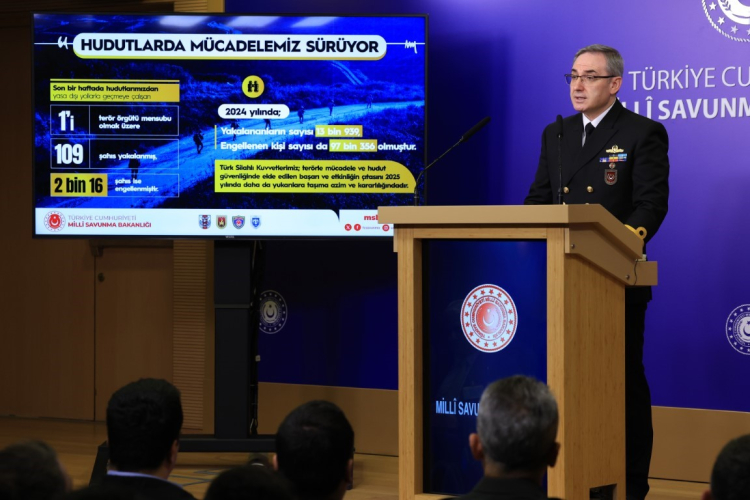 “Diğer taraftan terör yuvalarına kilit vurmaya devam eden Türk Silahlı Kuvvetlerimiz; geçtiğimiz hafta Pençe-Kilit Operasyonu bölgesinde teröristlere ait birçok bölümü bulunan mağara ile yine içerisinde çok sayıda silah, mühimmat ve yaşam malzemesi bulunan bir mağarayı tespit etmiştir.” Hudut hattında 1’i terörist toplamda 109 kişinin yakalandığını belirten Tuğamiral Aktürk, “2 bin 16 şahıs ise engellenmiştir. 7 gün 24 saat esasıyla çok yönlü ve etkin tedbirlerinin alındığı hudutlarımızdaki başarı rakamlara da yansımış; 2024 yılında hudutlarımızdan yasa dışı yollarla geçmeye çalışırken yakalananların sayısı 13 bin 939, engellenen kişi sayısı da 97 bin 356 olmuştur. Türk Silahlı Kuvvetlerimiz; terörle mücadele ve hudut güvenliğinde elde edilen başarı ve etkinliğin çıtasını 2025 yılında daha da yukarılara taşıma azim ve kararlılığındadır” şeklinde konuştu. Bölgesel ve küresel barış için öncü bir rol üstlenen TSK’nın birçok coğrafyada başarıyla görev yapmaya devam ettiğini hatırlatan Tuğamiral Aktürk, “13 yıllık iç savaşın ardından tarihî bir dönemden geçen komşumuz Suriye’de; mevcut durum ve gelişmeler yeni yönetim ile iş birliği ve koordinasyon içerisinde yakından takip edilmekte, Suriye’nin birliği ve toprak bütünlüğü ile terörle mücadeleye verdiğimiz önem ve öncelik kapsamında Suriye’nin güvenlik ve savunma kapasitesinin artırılmasına yönelik hazırlıklara devam edilmektedir. Birliklerimiz tarafından bölgede istikrarın sürdürülmesine yönelik gerekli tüm tedbirler alınmakta, Suriyelilerin gönüllü, güvenli ve saygın bir şekilde dönüşlerinin sağlanmasına yönelik çalışmalar sürdürülmektedir” diye konuştu.