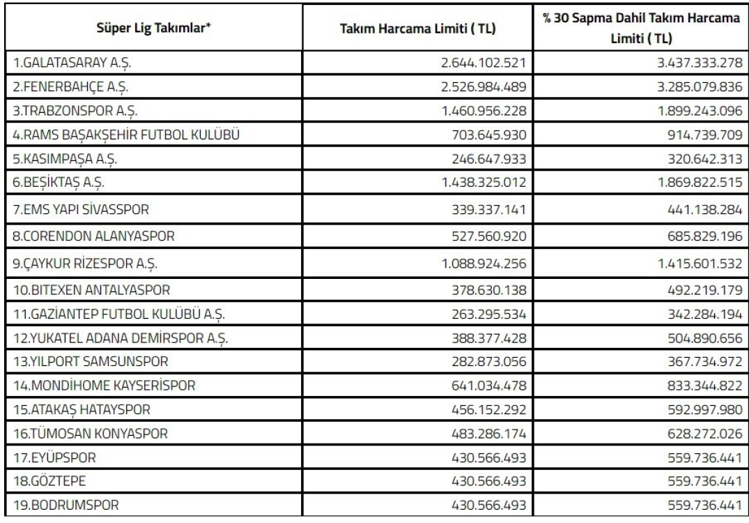 Türkiye Futbol Federasyonu Kulüp Lisans Kurulu, 19 Haziran 2024 tarihli toplantısında 2024-2025 Sezonu Süper Lig Takım Harcama Limitleri'ni belirledi. 2023-2024 sezonunu şampiyonlukla tamamlayan Galatasaray’ın yeni sezondaki harcama limiti 3 milyar 437 milyon 333 bin 278 TL olarak belirlendi. Kurul tarafından Fenerbahçe’ye 3 milyar 285 milyon 79 bin 836 TL, Trabzonspor’a 1 milyar 899 milyon 243 bin 96 TL, Beşiktaş’a 1 milyar 869 milyon 822 bin 515 TL’lik harcama limiti verildi.