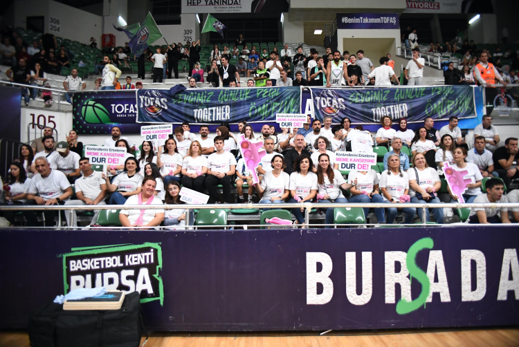 FIBA EuroCup A Grubu ilk hafta mücadelesinde Tofaş ile Keravnos arasında oynanan karşılaşma öncesi basketbolcular, meme kanserine dikkat çekmek için 'dur' dedi.