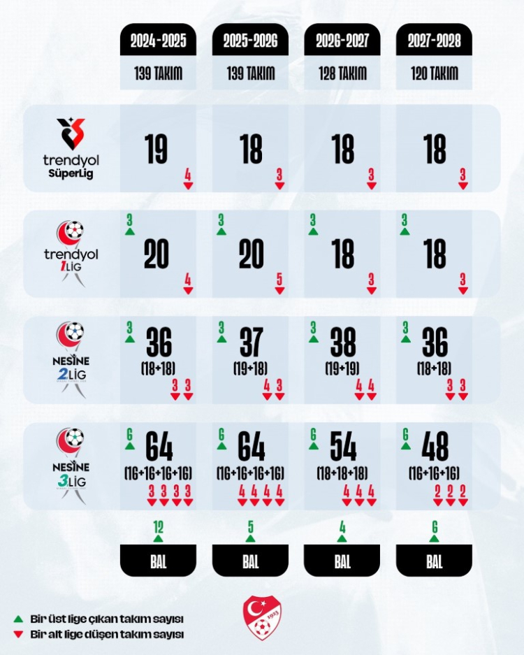 2020-2021 sezonunda 21 takımla oynanan Süper Lig başta olmak üzere, tüm liglerde kademeli olarak takım sayısının düşürülmesi hedeflense de 2023’teki deprem felaketinden etkilenen kulüplerin ligden çekilme talepleri sebebiyle hedeflenen sayıya ulaşılamadı. 2025-2026 sezonu itibarıyla takım sayısının kademeli olarak azaltılmasına gidilecek ve halihazırda 139 olan profesyonel takım sayısı, düşme ve çıkma sayılarına göre 120’ye düşürülecek.