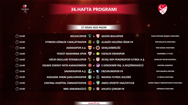 Türkiye Futbol Federasyonu (TFF), Trendyol 1. Lig’de 36. haftanın programını açıkladı. Söz konusu haftada tüm maçlar 27 Nisan Pazar günü saat 16.00’da oynanacak.