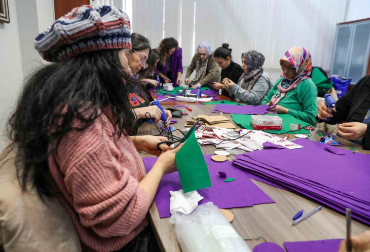 Bursa Kent Konseyi Kadın Meclisi’nde gerçekleştirilen atölye çalışmasında, keçe kumaşlar, renkli iplikler, düğmeler ve süsleme malzemeleri kullanılarak birbirinden renkli ürünler hazırlandı. Kadınların dayanışma ve ortak üretim gücünü bir kez daha ortaya koyan ürünler, 8 Mart Pazar günü yapılacak yürüyüşte kullanılacak.