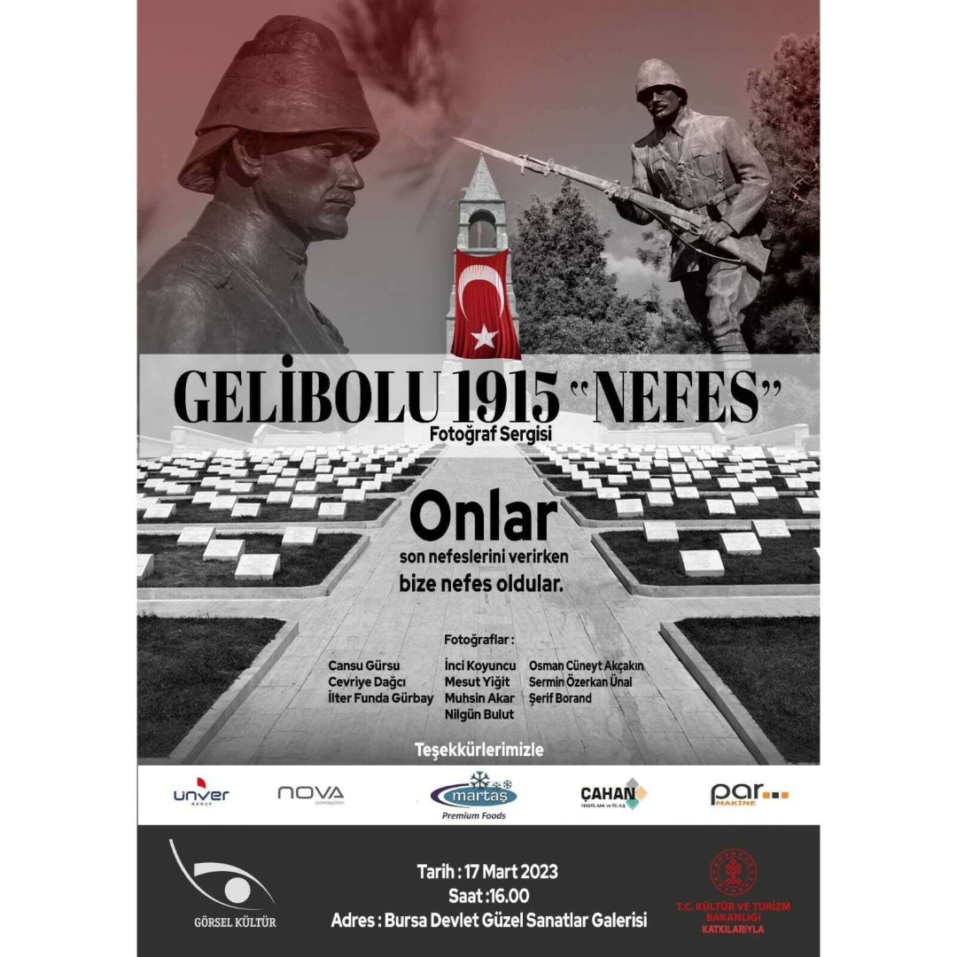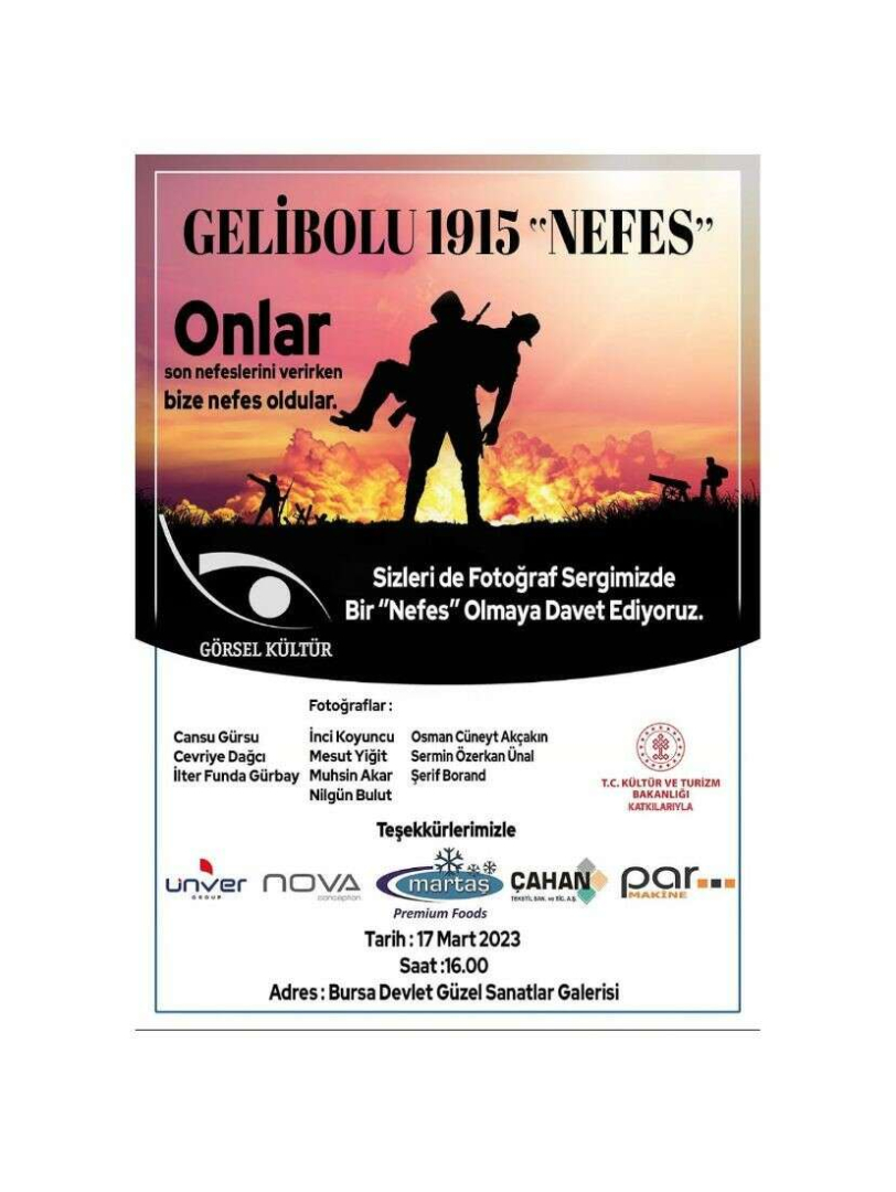 Cumhuriyetin 100. yılını borçlu olduğumuz Çanakkale ve Gelibolu şehitlerini anmak ve onların üzerlerimizdeki haklarını gelecek kuşaklara aktarılmasını sağlayacak farkındalığı oluşturmak isteyen Bursa Görsel Kültür Derneği, 'Nefes' isimli fotoğraf sergisini açıyor. 17 Mart Cuma günü saat 16.00’da açılacak sergi, 26 Mart Cumartesi gününe kadar Bursa Devlet Güzel Sanatlar Galerisi’nde ziyaret edilebilecek. Dernek üyesi 10 fotoğrafçının 8 günlük Gelibolu’da çalışması sonucu, 90 fotoğraflık sergide iki video sunumu da yapılacak. Öte yandan Çanakkale Savaşları Alan Başkanlığı'nın desteği ile Gelibolu ve Çanakkale Savaşlarında kullanılan tarihi objeler de özel korumayla Bursa'ya getirilerek sergi alanında ziyaretçilere sunulacak.