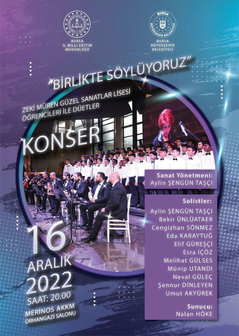 Bursa’nın ilk ve tek sanat lisesi Zeki Müren Güzel Sanatlar Lisesi öğrencileri 16 Aralık’ta Türk sanat müziğinin sevilen isimleriyle aynı sahnede buluşacak. 16 Aralık Cuma gecesi saat 20.00’de Merinos AKKM Orhangazi Salonu’nda düzenlenecek ve sanat yönetmenliğini Milli Eğitim Bakanlığı Danışmanı Aylin Şengül Taşçı’nın üstlendiği ‘Birlikte Söylüyoruz’ etkinliğinde Aylin Şengül Taşçı, Bekir Ünlüataer, Cengizhan Sönmez, Eda Karaytuğ, Elif Güreşçi, Esra İçöz, Melihat Gülses, Münip Utandı, Neval Güleç, Şennur Dinleyen ve Umut Akyürek gibi Türk sanat müziğinin dev sesleriyle birlikte birbirinden güzel eserlerden oluşan repertuarı seslendirecekler.
