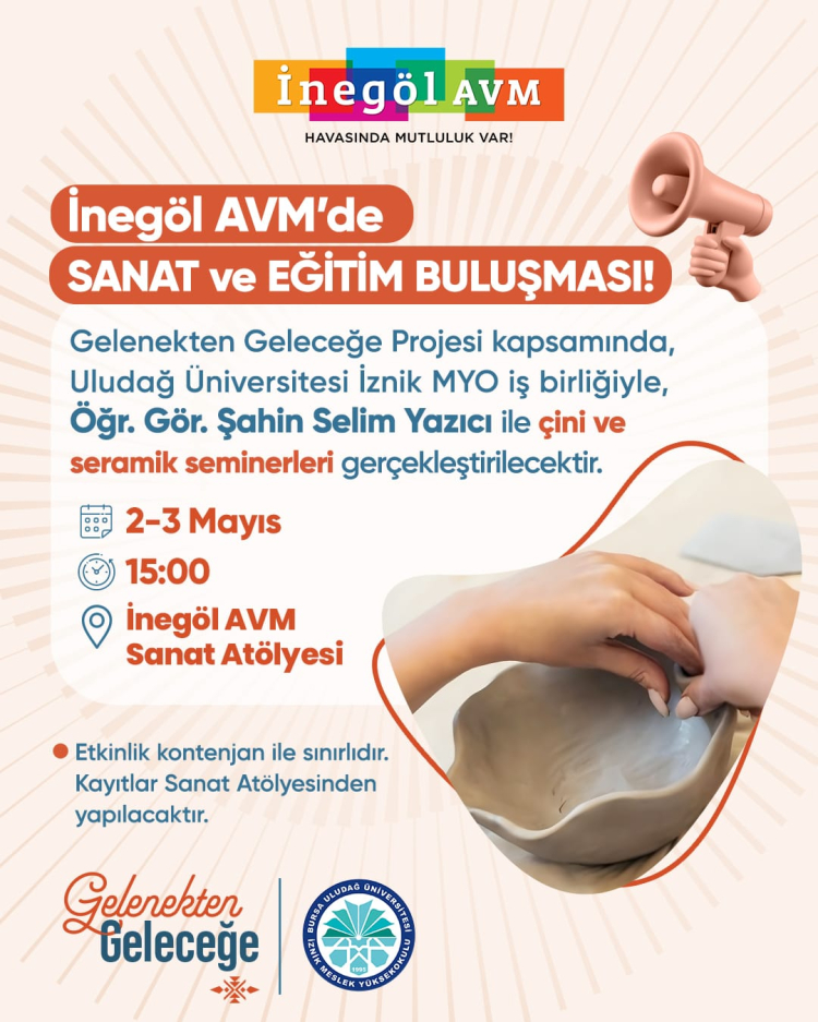 Fiba CP’nin yatırımcısı ve yöneticisi olduğu İnegöl AVM, ziyaretçilerini kültür ve sanat yolcuğuna çıkarıyor. Geleneksel el sanatlarını gelecek nesillere aktarmayı amaçlayan ‘Gelenekten Geleceğe Projesi’ kapsamında, Uludağ Üniversitesi İznik Meslek Yüksekokulu iş birliğiyle özel bir etkinlik serisi düzenleniyor. 2-3 Mayıs tarihlerinde saat 15.00’da gerçekleşecek etkinliklerde, çini ve seramik sanatının usta ismi Öğr. Gör. Şahin Selim Yazıcı, sanatseverlerle buluşacak.