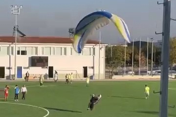 Maçın oynandığı sahaya paraşütle iniş yaptı