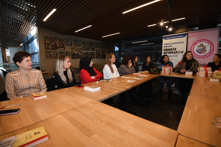 Cengiz Aytmatov’un Türk dünyası için edebiyatta önemli bir yere sahip olduğuna işaret eden Uludağ Üniversitesi Fen Edebiyat Fakültesi Türk Dili ve Edebiyatı Bölümü Öğretim Görevlisi Ayşe Energin, "Sanatlararası Sergisi’nde Cengiz Aytmatov dedik, bozkırdan dünyaya uzanan el, bozkırın sesi, bozkırın bilgesi dedik. Tam da buradan hareketle sergimizin kapanışını bir kolektif okumayla gerçekleştirdik. Burada kitapsever dostlarımızla birlikte Aytmatov’un ‘Elveda Gülsarı’ adlı kitabını inceledik." diye konuştu.